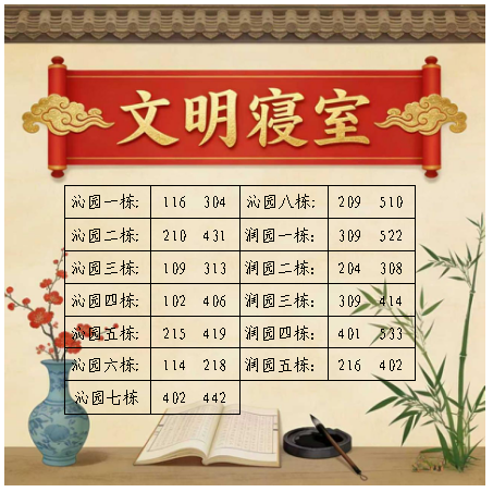 本次评选以“文明整洁、学风浓厚、团结和谐”为核心标准,经过自律委严格筛选。评审组通过实地检查寝室卫生状况,对接受检查的寝室整体表现进行全面考评,最终评选出“文明寝室”26间。