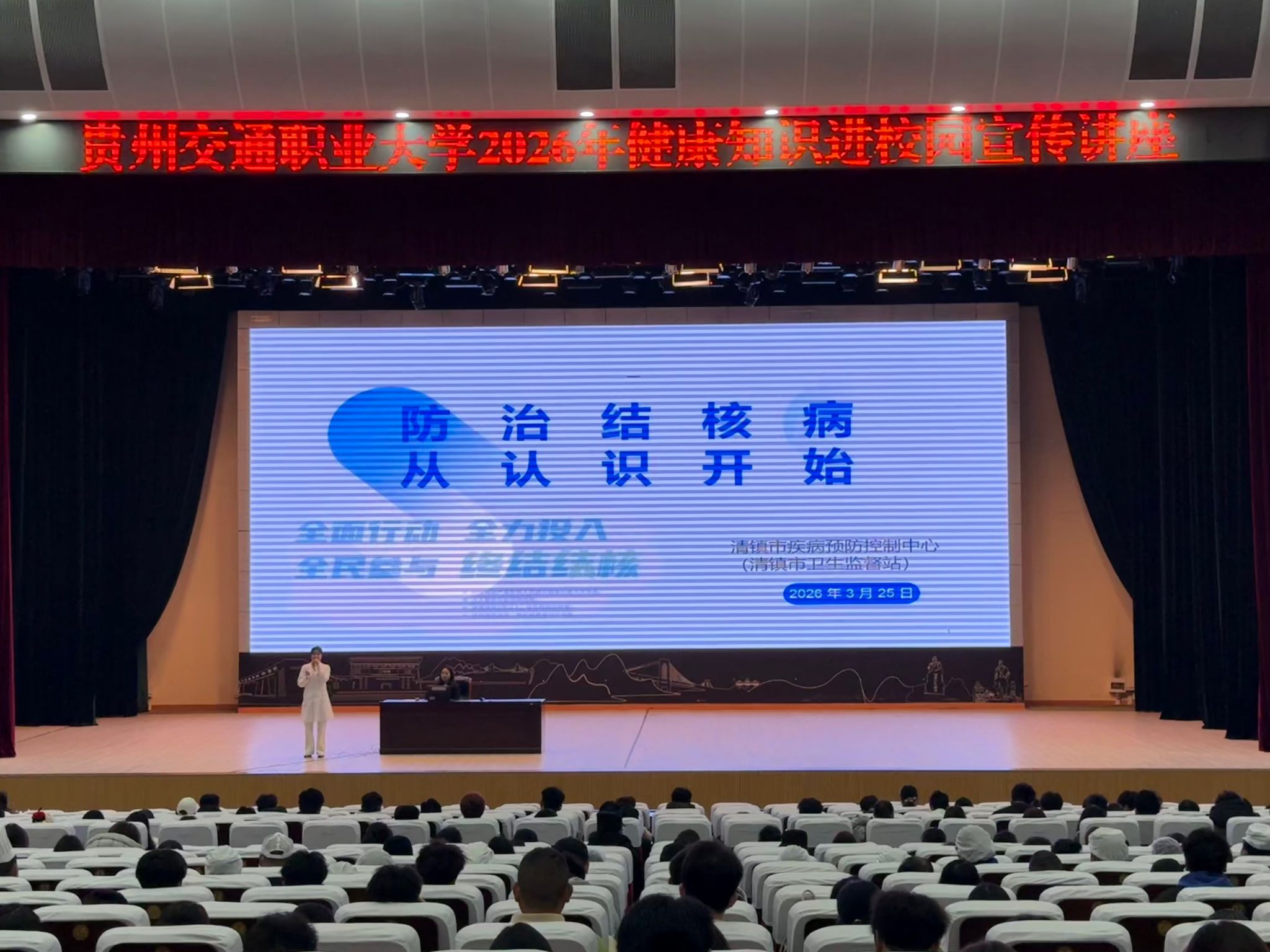 为做好第31个“世界防治结核病日”主题宣传工作,切实增强师生传染病防治意识,2026年3月25日,我校在大礼堂开展了以“全面行动 全力投入 全民参与 终结结核”为主题的讲座。讲座以传染病防治科普讲座为主要形式,各学院师生代表及后勤第三方服务单位人员共同参与。