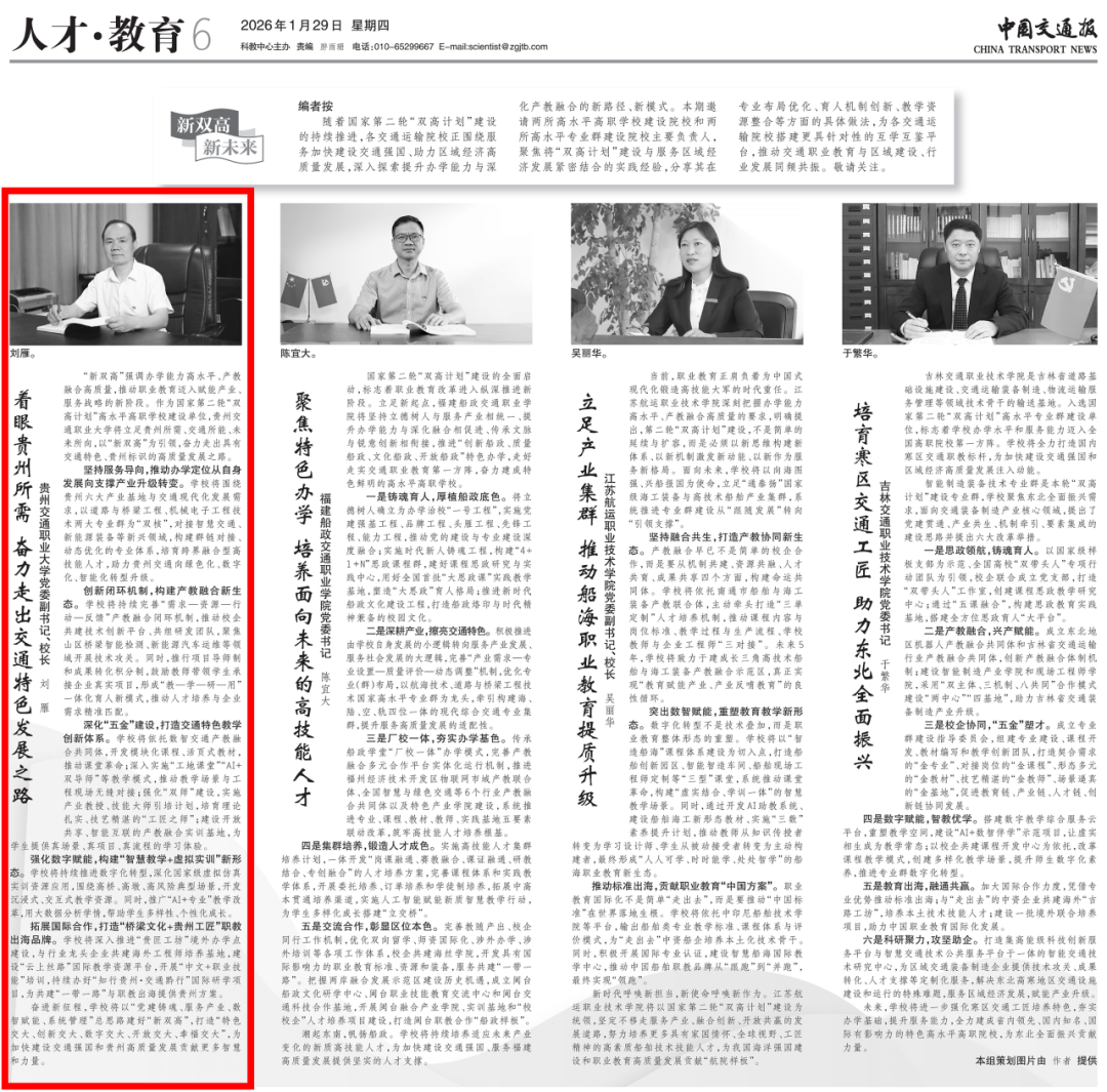 1月29日,《中国交通报》人才教育版块刊发我校党委副书记、校长刘雁署名理论文章《着眼贵州所需 奋力走出交通特色发展之路》。文章紧扣国家第二轮“双高计划”建设和服务区域经济发展,围绕办学定位升级、产教融合生态、教学创新体系、数字赋能教学、职教出海品牌五大维度,系统阐述了贵州交通职业大学立足贵州所需、服务交通强国战略的高质量发展路径。